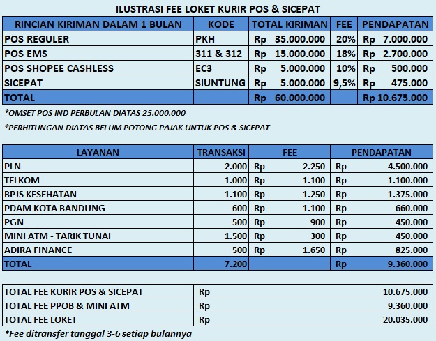 | POS EKONOMI [PPB_PKT] | FEE 3,5% | FEE 3,5% | KIRIMAN LUAR NEGERI | OMSET DIBAWAH 25 JT | OMSET DIATAS 25 JT | POS EMS (EXPRESS MAIL SERVICE) [311 & 312] | FEE 16% | FEE 18% |